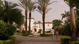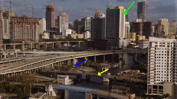 Then we see a brief overview establishing shot of Miami before returning to Jimbo’s where Fiona makes her presence known. The interesting thing about the overview establishing shot is that it showcases the building that stands on the site of Miami Vice’s O,C.B building that we saw the outside of in most of the episodes.