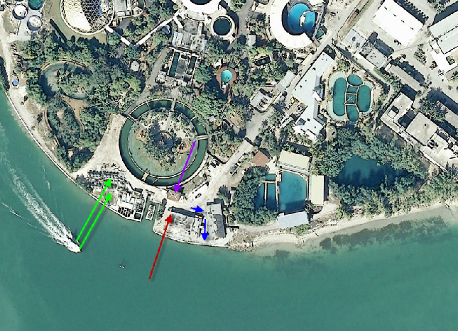 Red arrow points to Michael’s work place. Green arrows point to water filtration tanks we see in the background. Purple arrow points to building we see in the background when Michael comes out and see the bad guys. Blue arrows indicates Michael’s “escape” route.