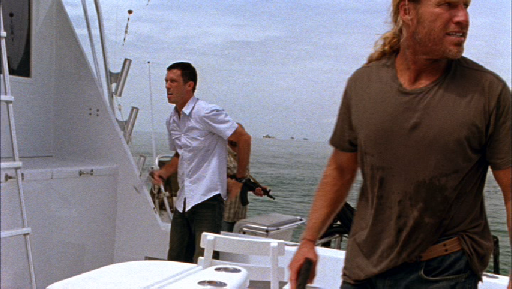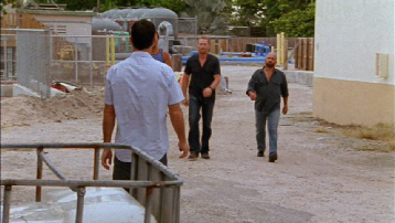 Then we see Michael working to load the pirate boat getting ready for the heist. This was also filmed at the Miami Seaquarium, behind the Flipper tanks.