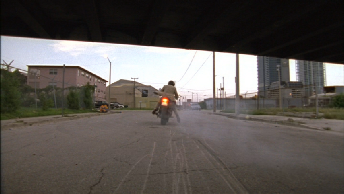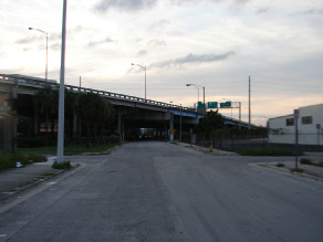 Then we see Michael 1 block west turning under the “59th Street Bridge”. He is turning at the NW corner of the parking lot bordered by NW 13th Street and NW 1st Avenue. Under the 395 elevated highway. This is commonly referred to as the 59th Street bridge because in the Pilot of Miami Vice they refer to this location as under the 59th Street bridge. Crockett’s partner at the time, Eddie Rivera along with drug dealer Corky were killed here when a bomb went off in Corky’s car that was parked about 30 feet west of where we see Michael here. In the street, just the other side of the fence.