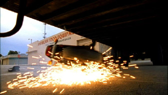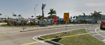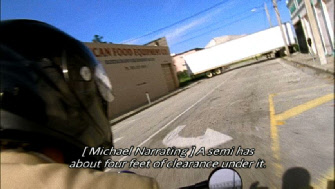 Then we see Michael turn right (east) onto NW 13th Street. There is a tractor trailer unit blocking the street and Michael dramatically slides under it to get away.