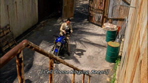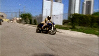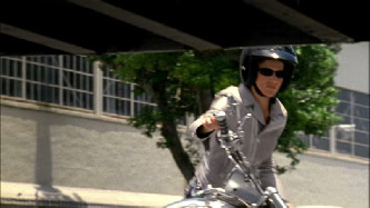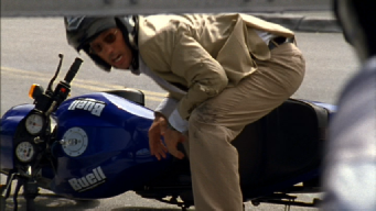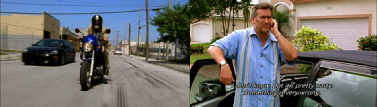 Also note that when Michael picks up the motorcycle there is a double yellow line on the road. When he takes off the road has no markings. Two different locations.