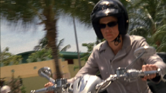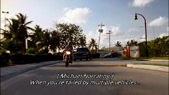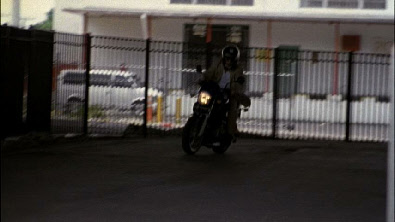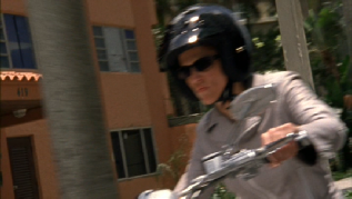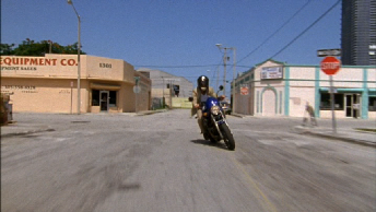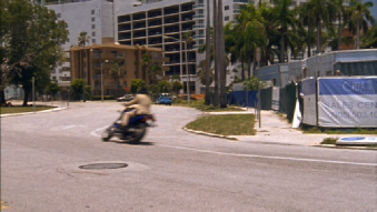 This leads us to a set up by Carla. This was filmed behind the studio at the Dinner Key Marina. Michael realizes the set up and steals a motorcycle. He takes off to return home, pick up the forged access card and stop the sniper.